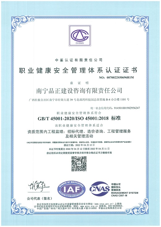 南寧品正于2000年通過ISO9001:2000質量體系認證,2009年改版為ISO9001:2008并通過認證;2016年5月同時通過GB/T19001-2008質量管理體系、GB/T28001-2001職業(yè)健康安全管理體系認證和GB/T24001-2004環(huán)境管理體系三體系認證。公司長期重視管理體系認證與實際工作的結合,制定行之有效的檢查及內審程序文件,形成了完整的《管理手冊》、《程序文件》、《標準作業(yè)指導書》三個層次的質量體系文件。每年定期進行工作質量檢查、質量體系內審和管理評審,確保公司整體質量、環(huán)境和職業(yè)健康安全工作的有效性、持續(xù)性,達到規(guī)范化和標準化。