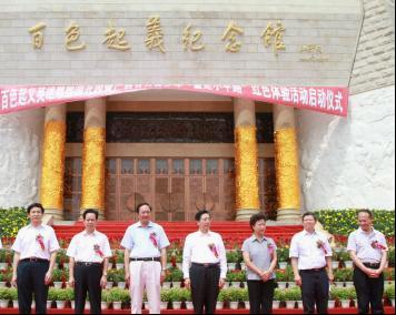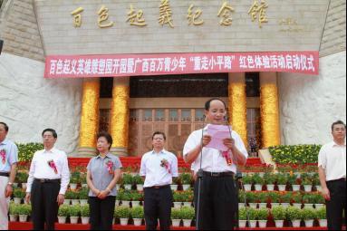 6月28日下午,百色市百色起義紀念館廣場紅旗招展,紅歌激揚,百色起義英雄雕塑園開園暨廣西百萬青少年“重走小平路”紅色體驗活動啟動儀式在這里隆重舉行。廣西自治區(qū)黨委書記、自治區(qū)人大常委會主任郭聲琨出席儀式,并與自治區(qū)黨委副書記陳際瓦,自治區(qū)黨委常委、秘書長余遠輝一道,共同為團干部、青聯(lián)委員、青年文明號集體代表、少先隊員等青少年“重走小平路”團隊代表授旗,陳際瓦宣布百色起義英雄雕塑園開園、“重走小平路”紅色體驗活動啟動,嘹亮的軍號響徹廣場上空,正式拉開了“重走小平路”紅色體驗活動的序幕。