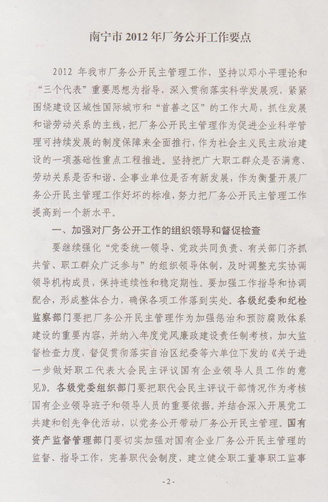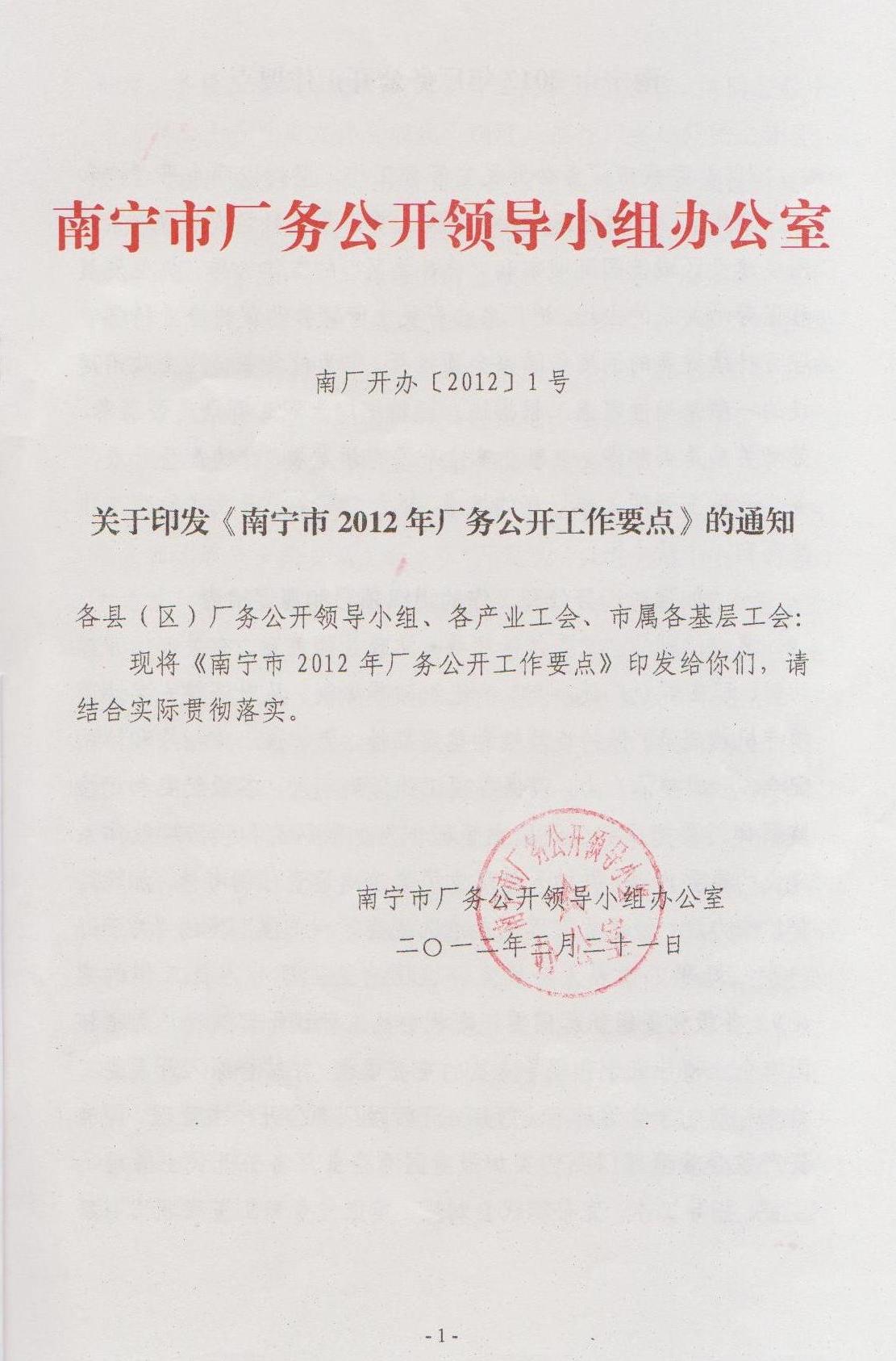 關(guān)于印發(fā)《南寧市2012年廠務(wù)公開(kāi)工作要點(diǎn)》的通知(南廠開(kāi)辦[2012]1號(hào))
