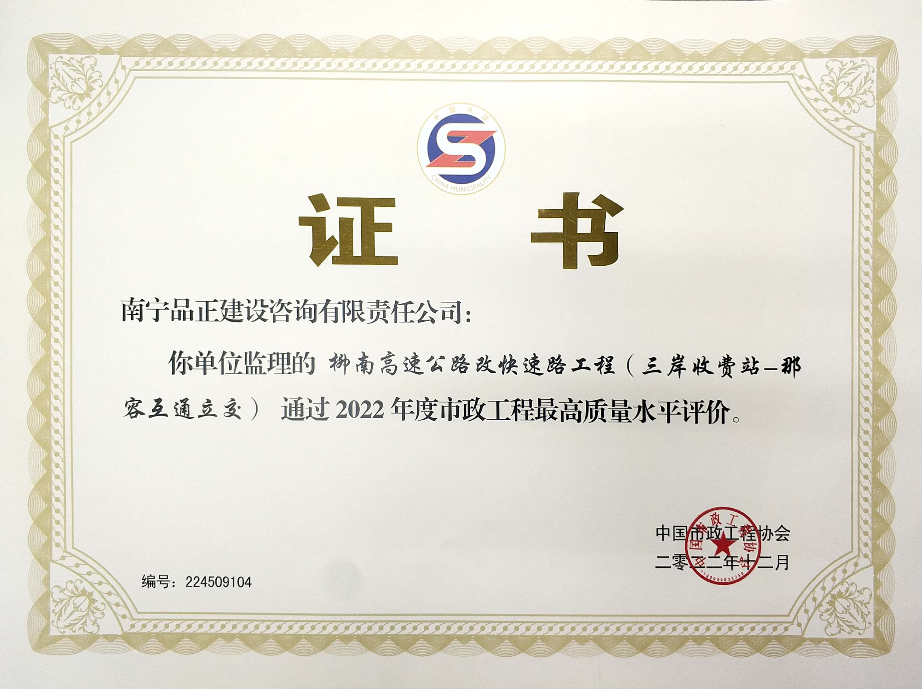 南寧品正建設(shè)咨詢有限責任公司監(jiān)理的柳南高速公路改快速路工程(三岸收費站-那容互通立交)獲“市政工程最高質(zhì)量水平評價”(原國家市政工程金獎)榮譽!市政工程最高質(zhì)量水平評價由中國市政工程協(xié)會評選,是市政工程行業(yè)在工程質(zhì)量方面最高的質(zhì)量水平評價,代表市政工程行業(yè)同時期國內(nèi)先進水平。