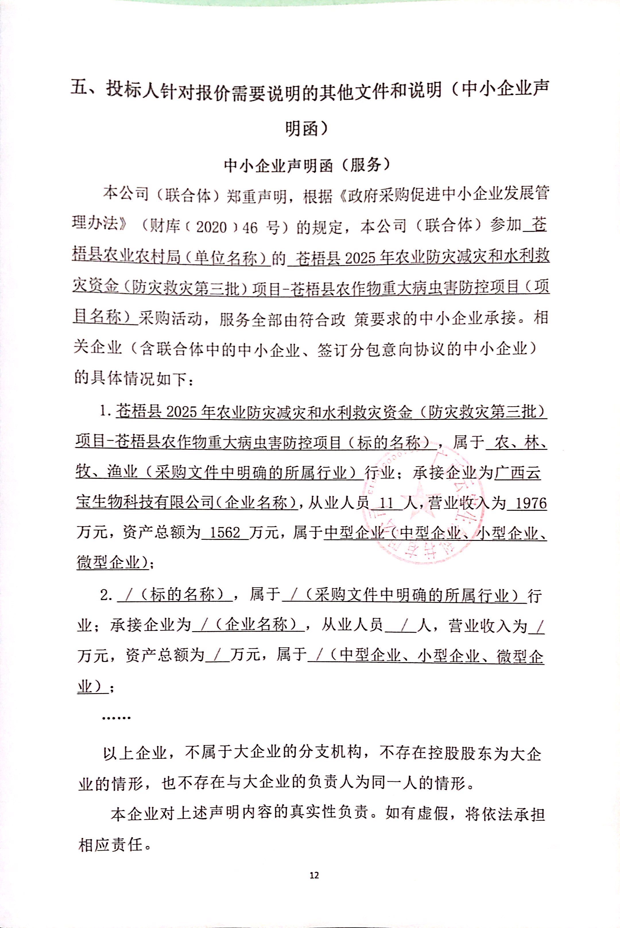 1 | 蒼梧縣2025年農(nóng)業(yè)防災(zāi)減災(zāi)和水利救災(zāi)資金(防災(zāi)救災(zāi)第三批)項(xiàng)目-蒼梧縣農(nóng)作物重大病蟲害防控項(xiàng)目 | 詳見競爭性談判文件和響應(yīng)文件內(nèi)容。 | 合同簽訂后 5 個工作日內(nèi)供貨,并在 20 個工作日內(nèi)完成項(xiàng)目內(nèi)容 | 1.國家強(qiáng)制性標(biāo)準(zhǔn)及有關(guān)規(guī)定。 2.競爭性談判采購文件的采購需求及成交供應(yīng)商響應(yīng)文件響應(yīng)的事項(xiàng)。 3.為確保貨物質(zhì)量避免假冒偽劣產(chǎn)品,供應(yīng)商必須在供貨時提供生產(chǎn)廠家針對此項(xiàng)目的售后服務(wù)保證函原件、供貨證明原件并加蓋生產(chǎn)廠家公章。 4.按以上列明需要提供證書、截圖、文件等資料一并提交我方后才可確認(rèn)驗(yàn)收,不提供或提交不全的不予確認(rèn)。 |