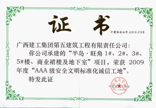 2010年6月,南寧品正負(fù)責(zé)監(jiān)理的半島·旺角1#2#3#5#樓及商業(yè)裙樓及地下室、廣西農(nóng)科院職工住宅樓(科苑小區(qū))工程榮獲中國建筑業(yè)協(xié)會(huì)頒發(fā)的 “AAA級安全文明標(biāo)準(zhǔn)化誠信工地”稱號(hào)。