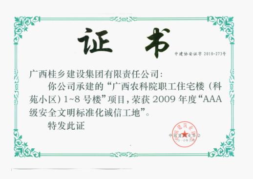 南寧品正負(fù)責(zé)監(jiān)理的半島·旺角工程、廣西農(nóng)科院職工住宅樓工程榮獲“2009年度“AAA級安全文明標(biāo)準(zhǔn)化誠信工地”稱號(hào)