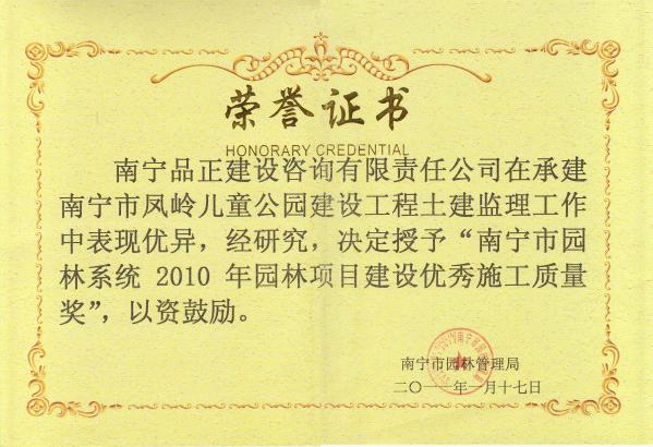 2011年1月17日,南寧品正負責監(jiān)理的南寧市鳳嶺兒童公園建設(shè)工程榮獲南寧市園林管理局頒發(fā)的“南寧市園林系統(tǒng)2010年園林項目建設(shè)優(yōu)秀施工質(zhì)量獎”。